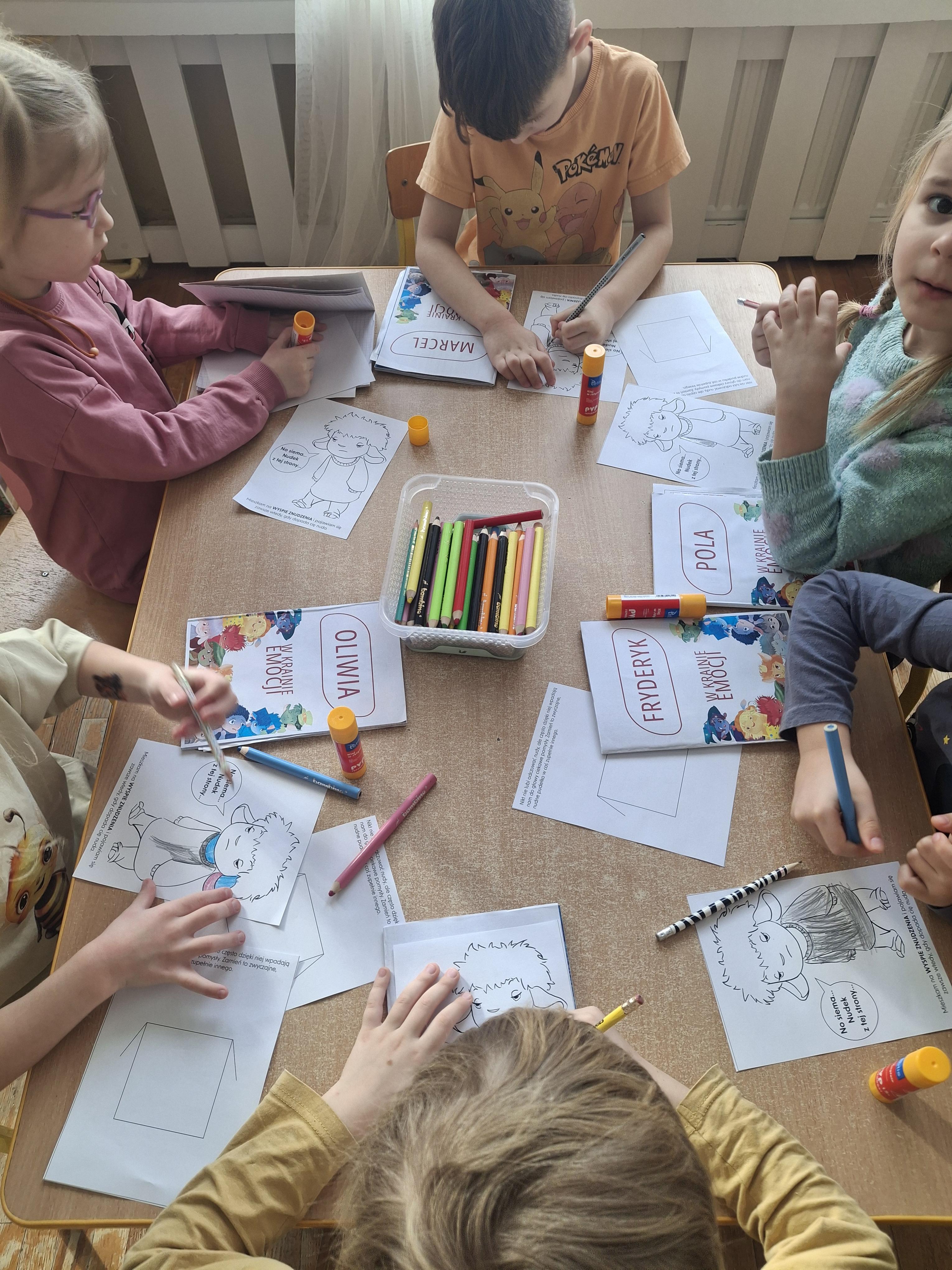 Przedszkolaki uzupełniły swoje emocjonalne książeczki. Przykleiły wklejki z postacią Nudka i pokolorowały bohatera według własnego pomysłu. Następnie wykonały kolejne zadanie – dokończyły rysunek, przedstawiając sytuację związaną z odczuwaniem nudy. Każda praca była wyjątkowa i odzwierciedlała indywidualne doświadczenia dzieci.