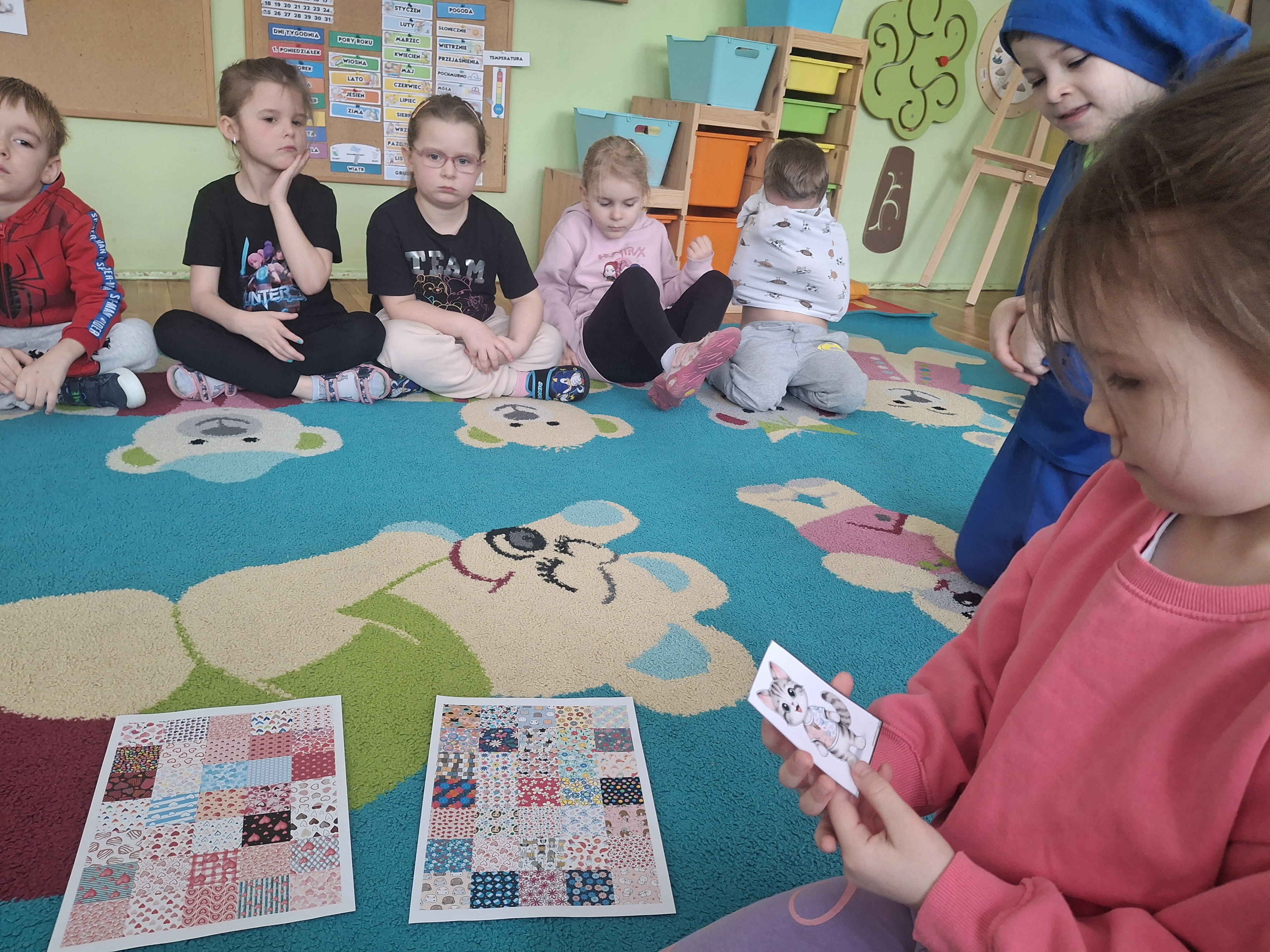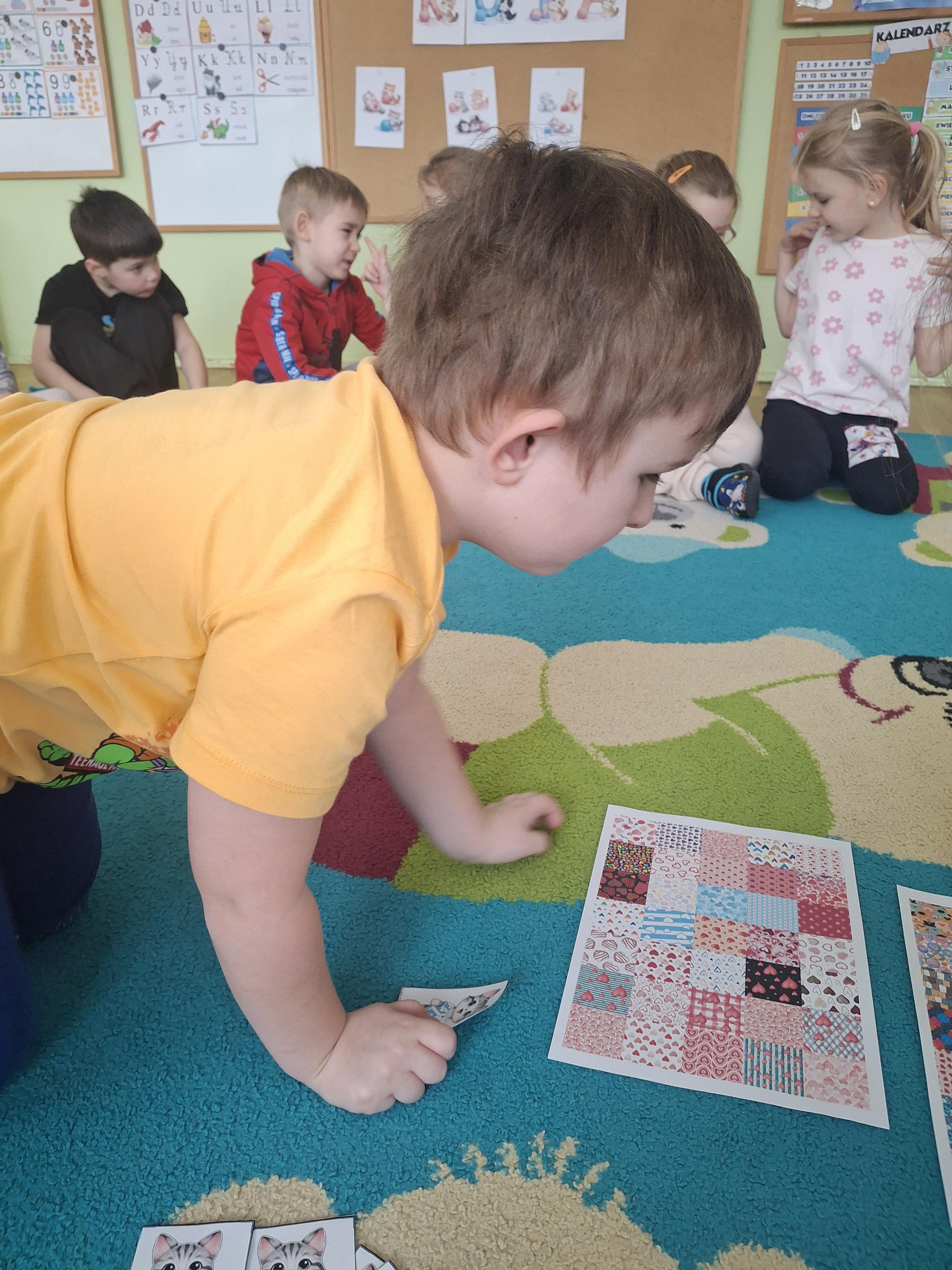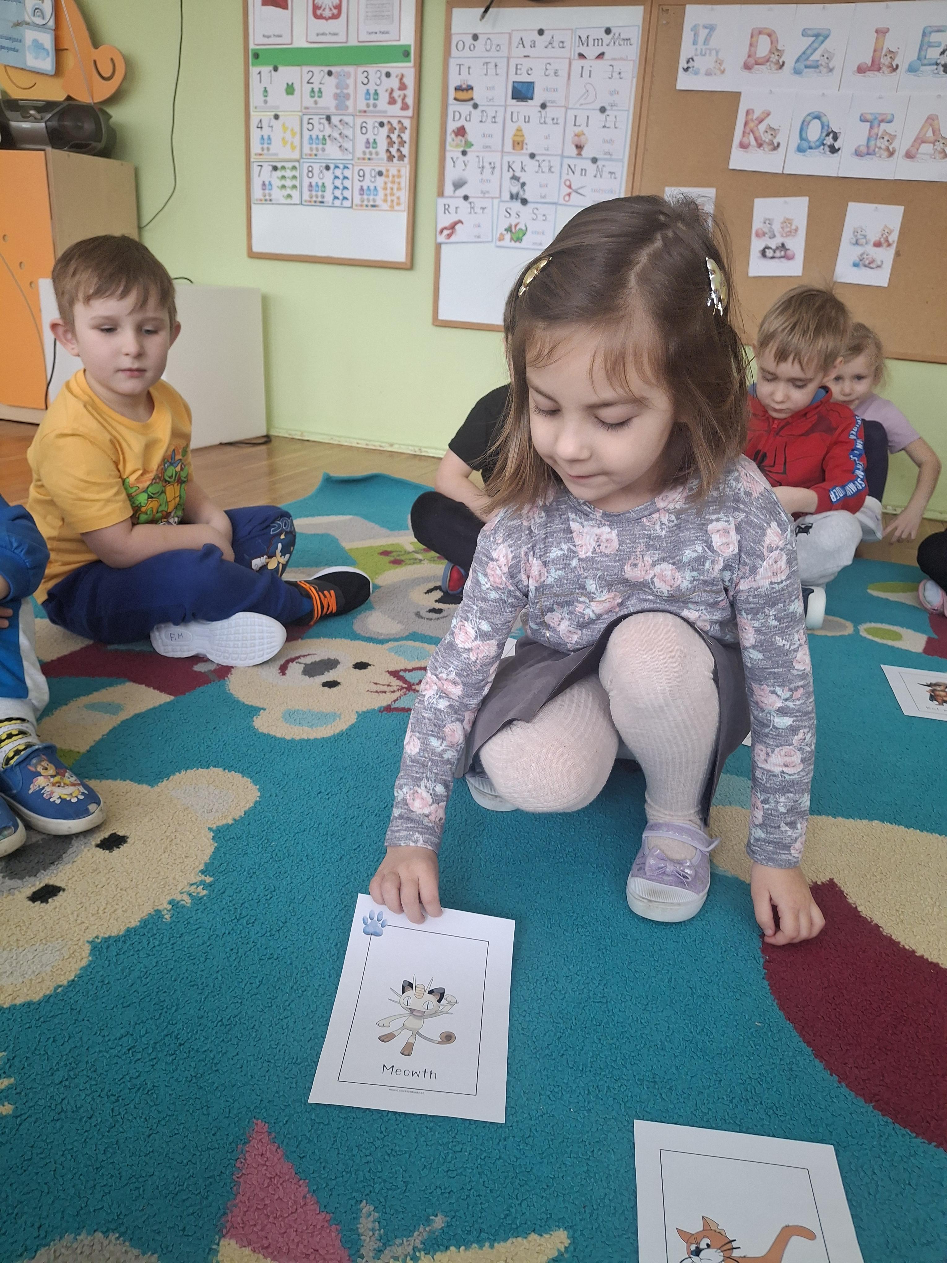 Następnie wzięliśmy udział w zabawie spostrzegawczej – wyszukiwaliśmy takie same sweterki kotków z plakatu. Ćwiczyliśmy koncentrację, uwagę i współpracę. Dzieci poradziły sobie znakomicie!