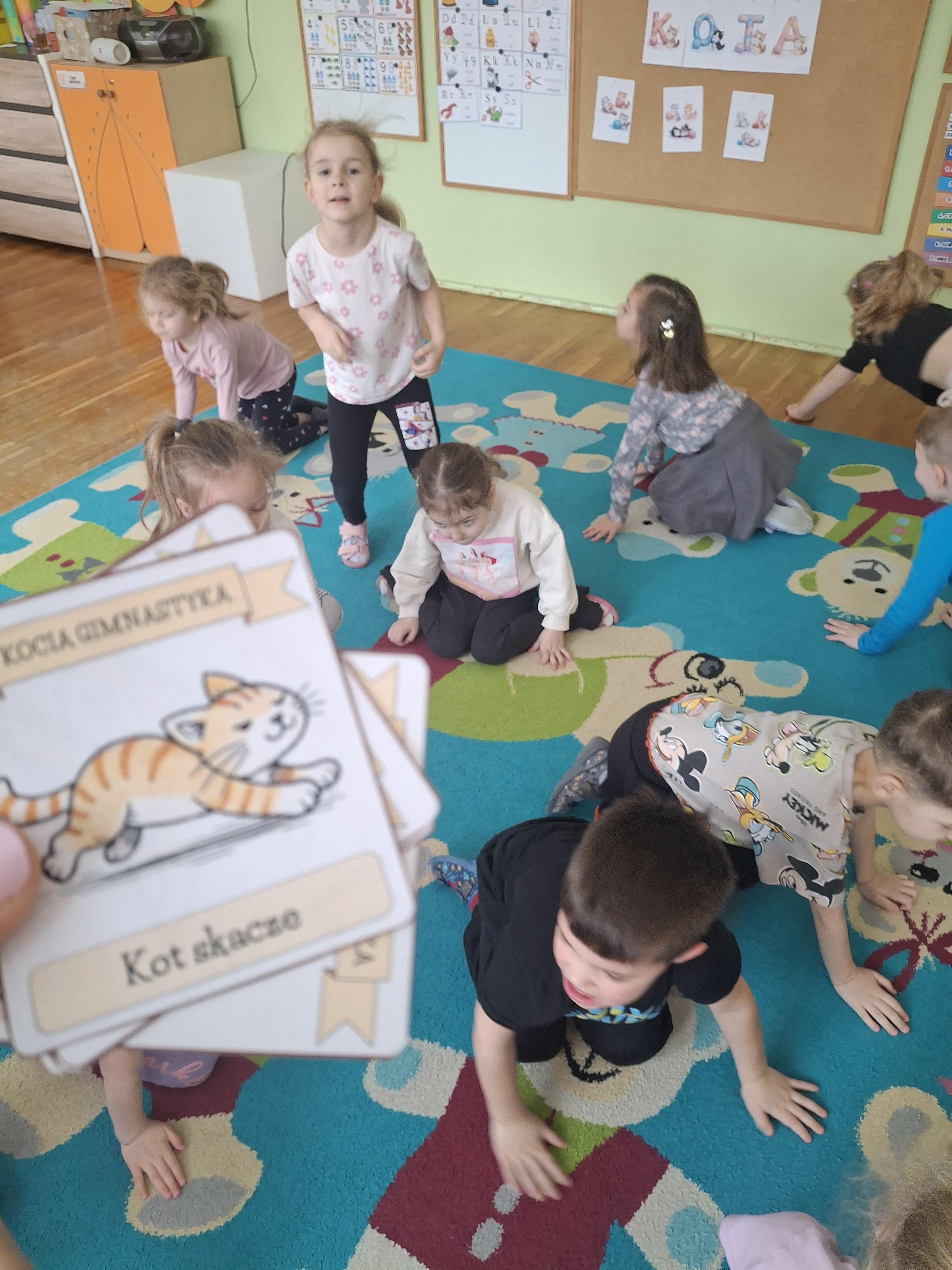 Nie mogło zabraknąć również kociej gimnastyki ? – przeciągaliśmy się jak kotki, cichutko skradaliśmy się na paluszkach i zwijaliśmy w kłębuszek. Ruch połączony z zabawą wywołał mnóstwo uśmiechów.