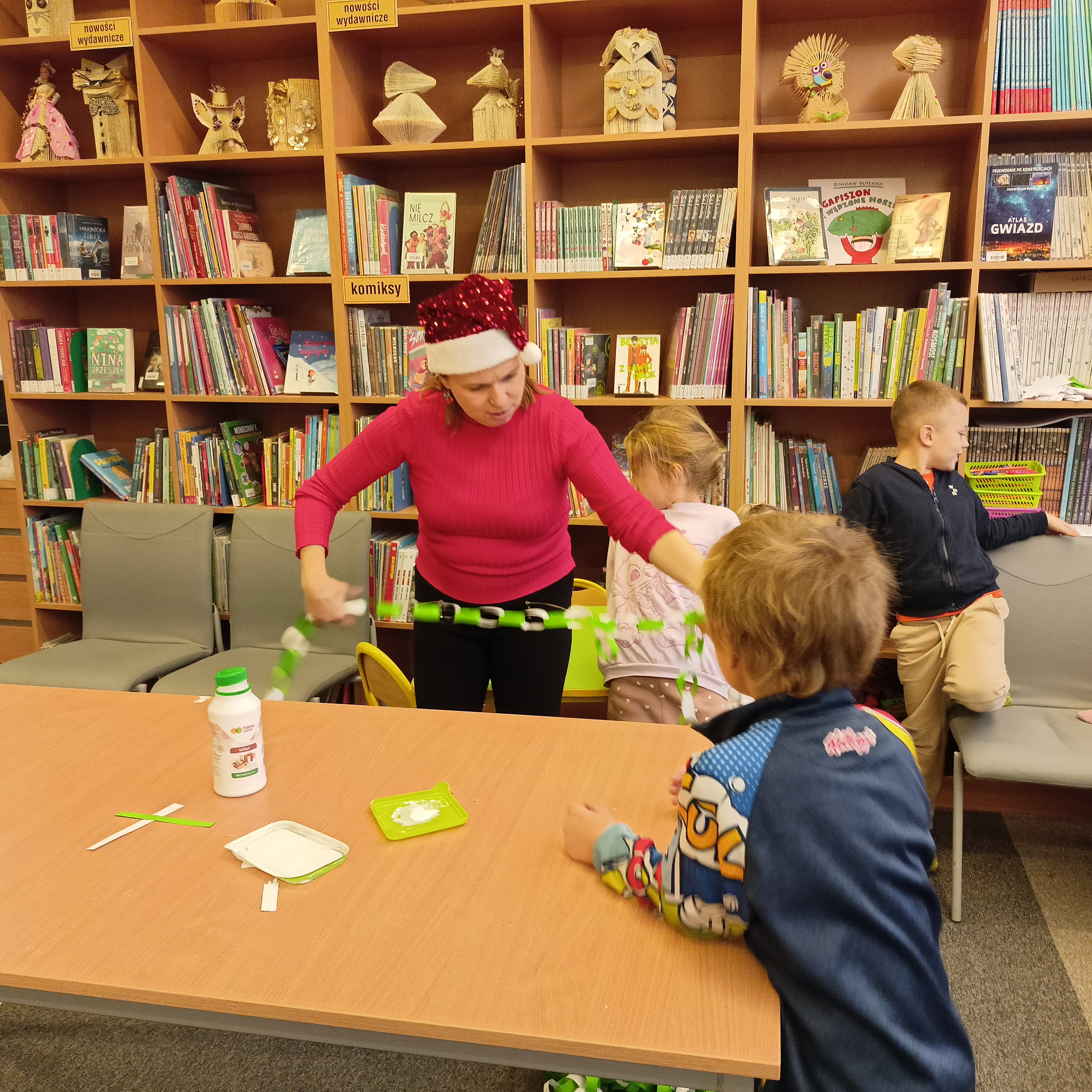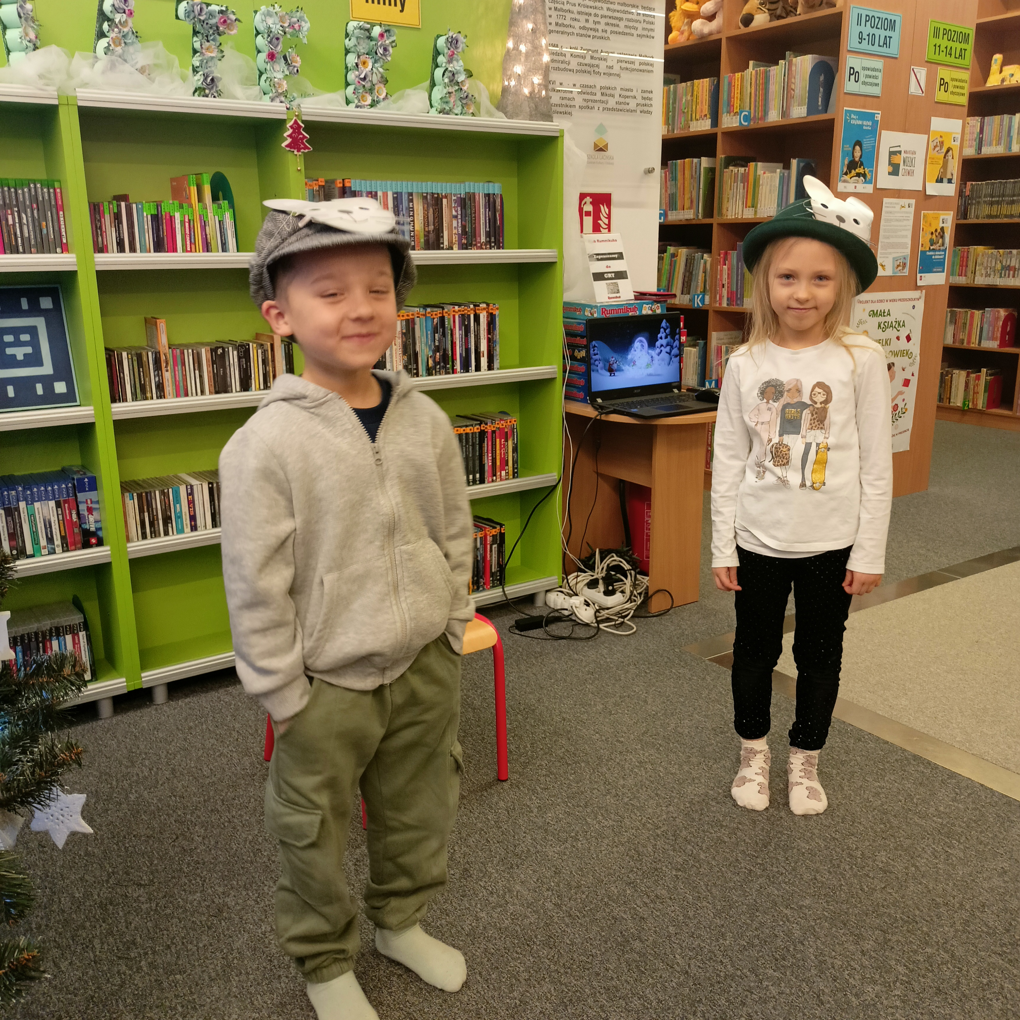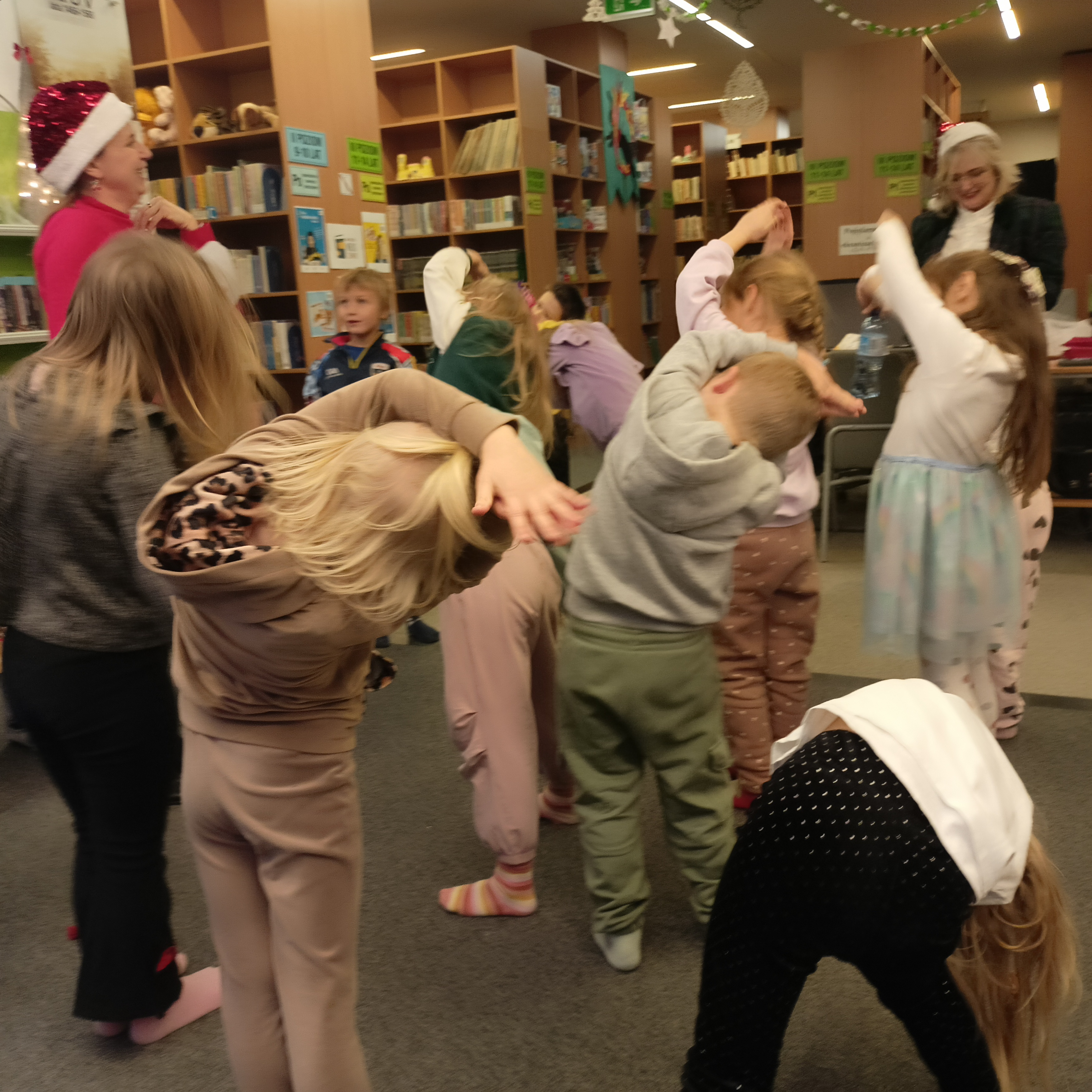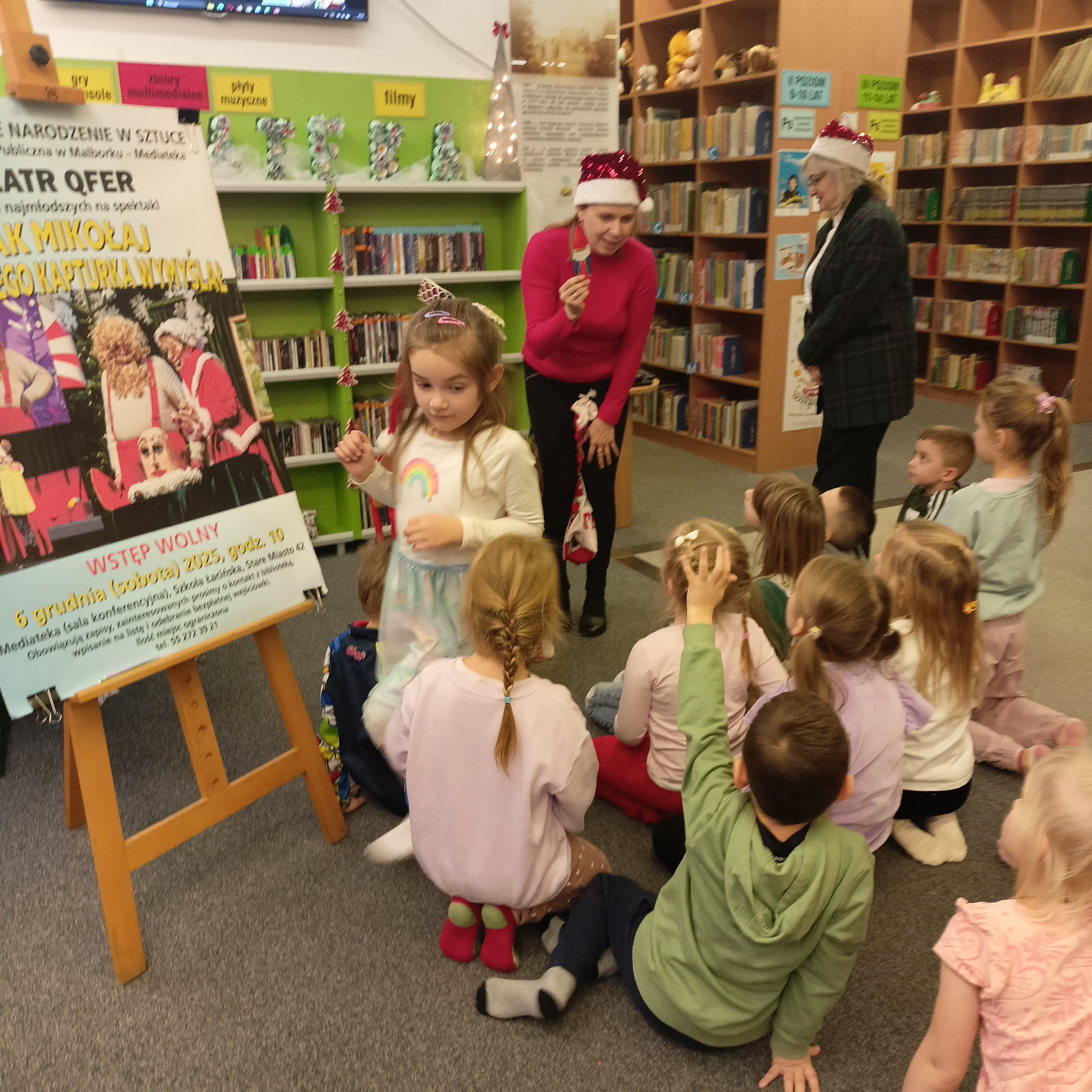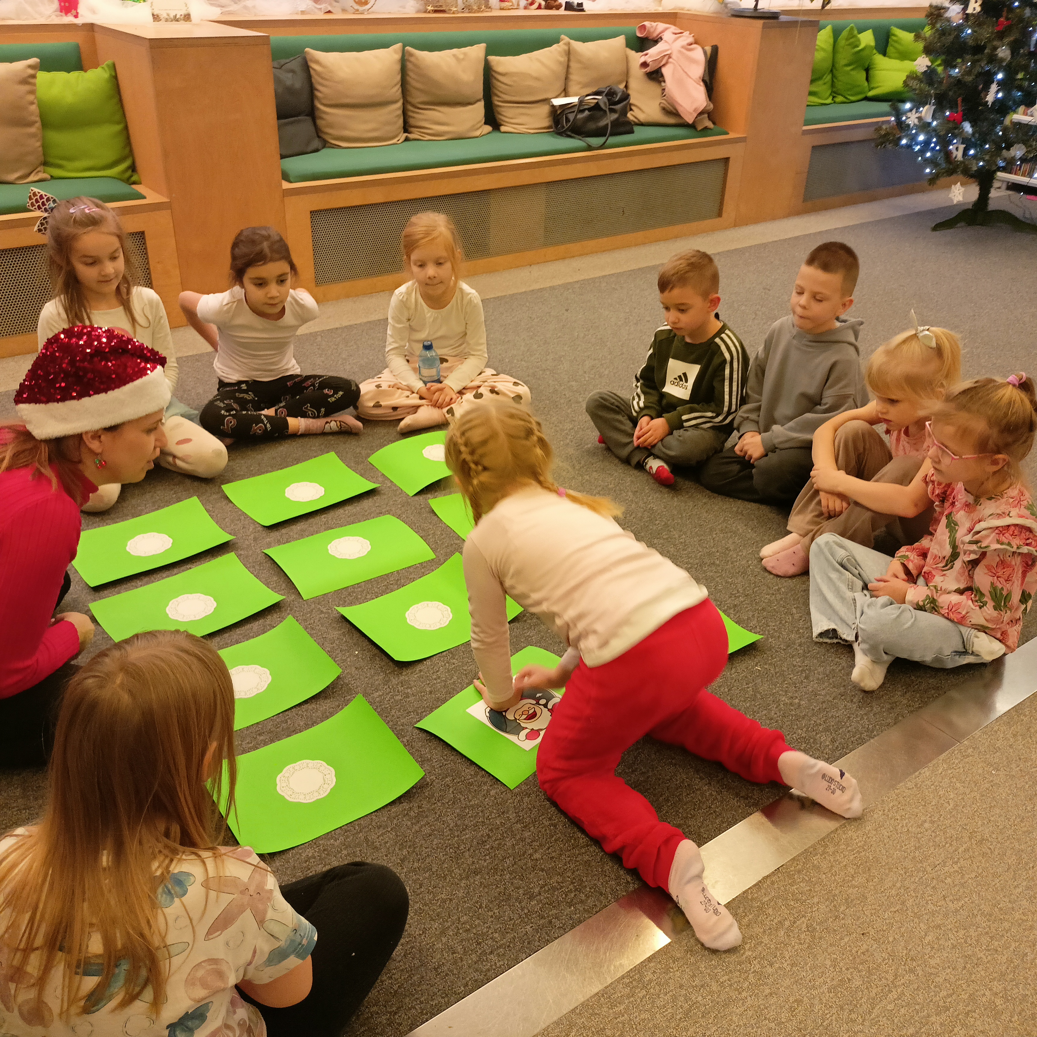 4 grudnia byliśmy na zajęciach Mikołajkowych w Mediatece. Bawiliśmy się wspanialep. Rozalia i Grześ odegrali role w mądrej bajce o zajączkach. Wspólnie szukaliśmy ukrytych w bibliotece na półkach 31 krasnoludków - nie odnaleźliśmy jednego. Poćwiczyliśmy i stworzyliśmy 35 metrów choinkowego łańcucha. Było super.