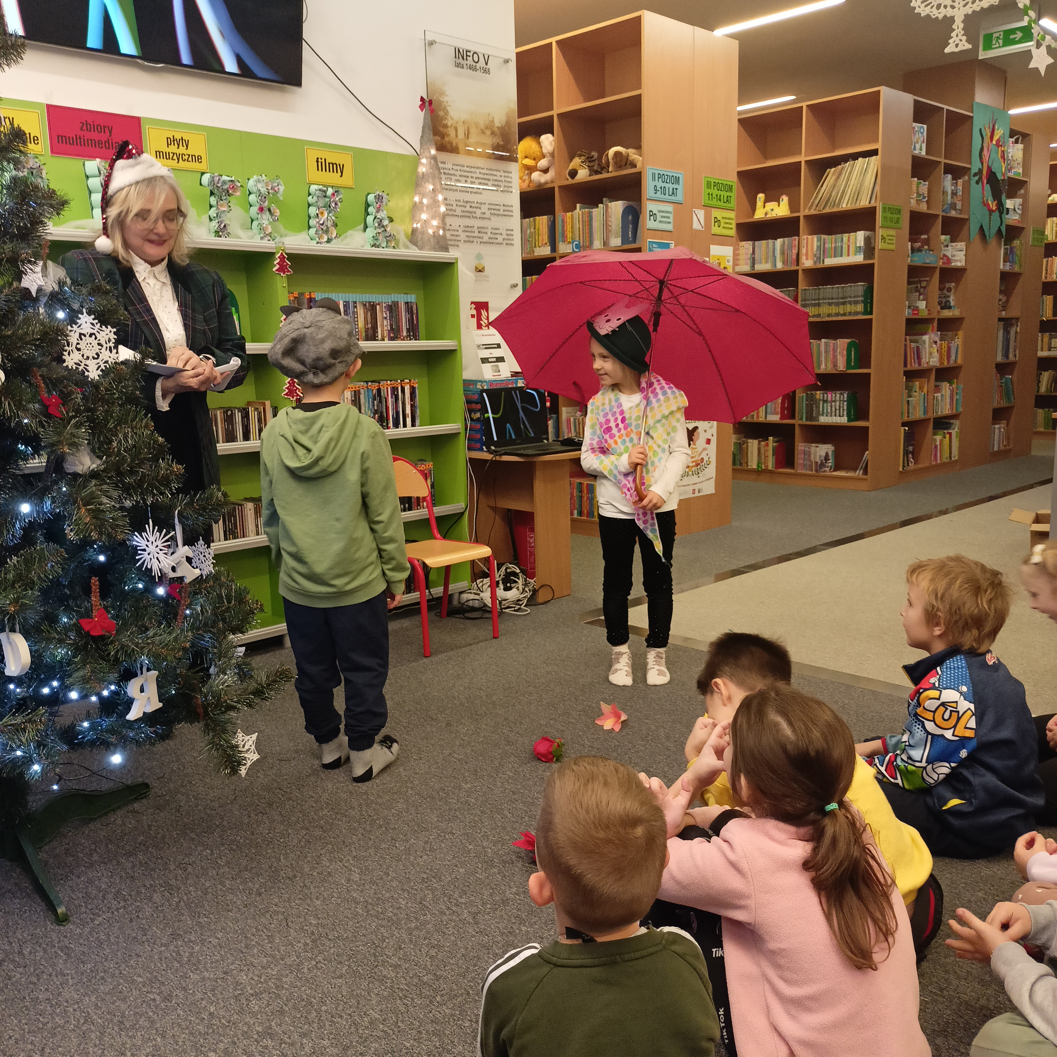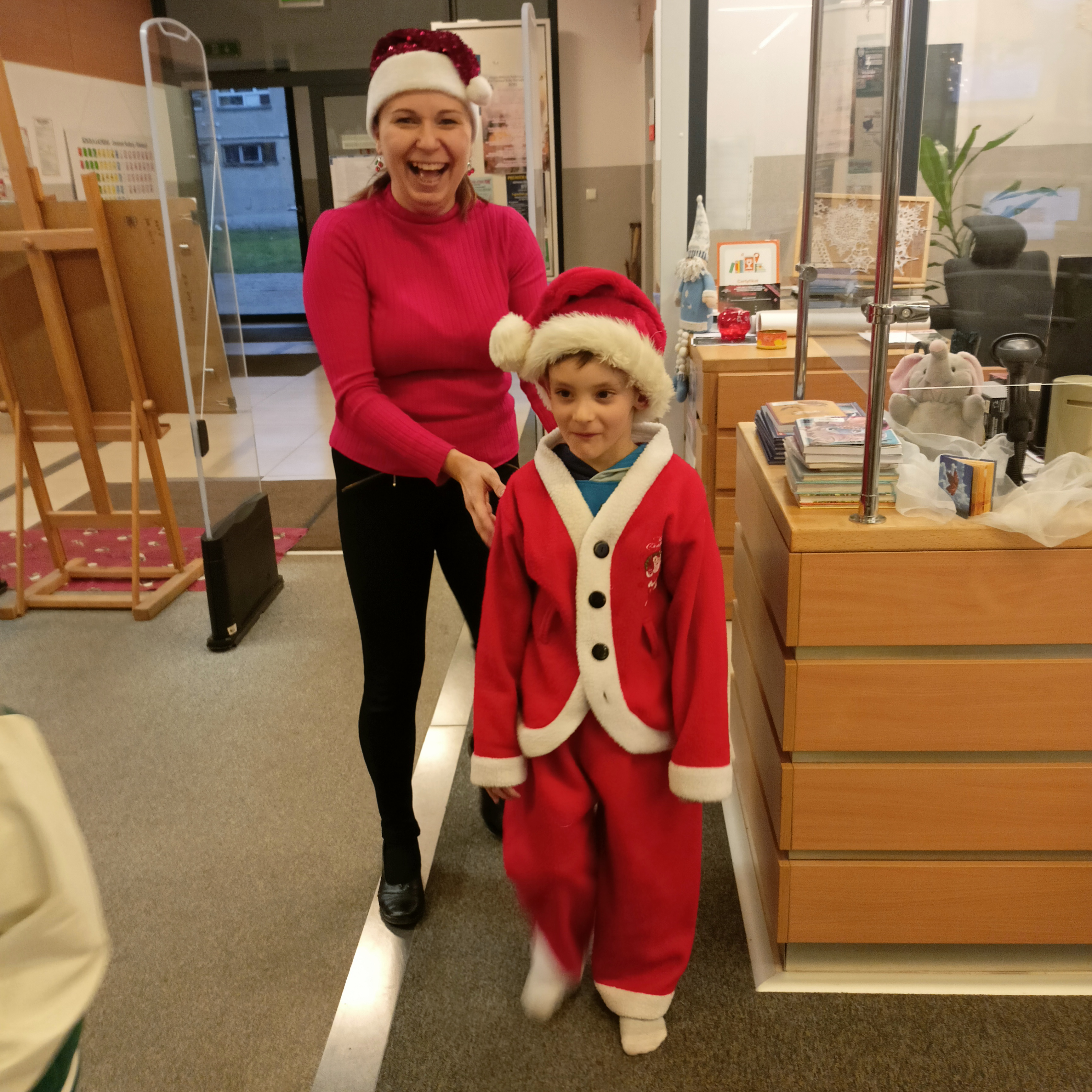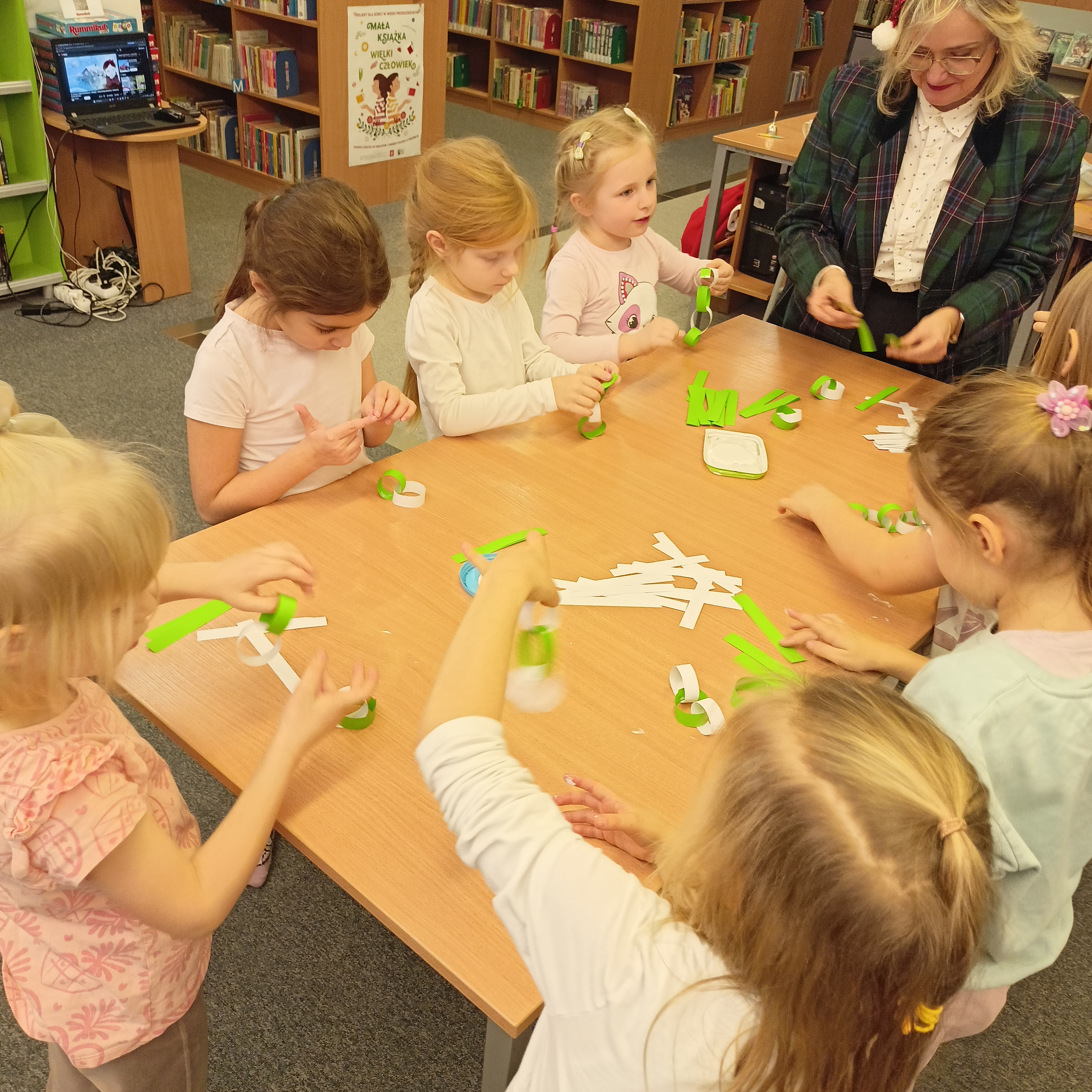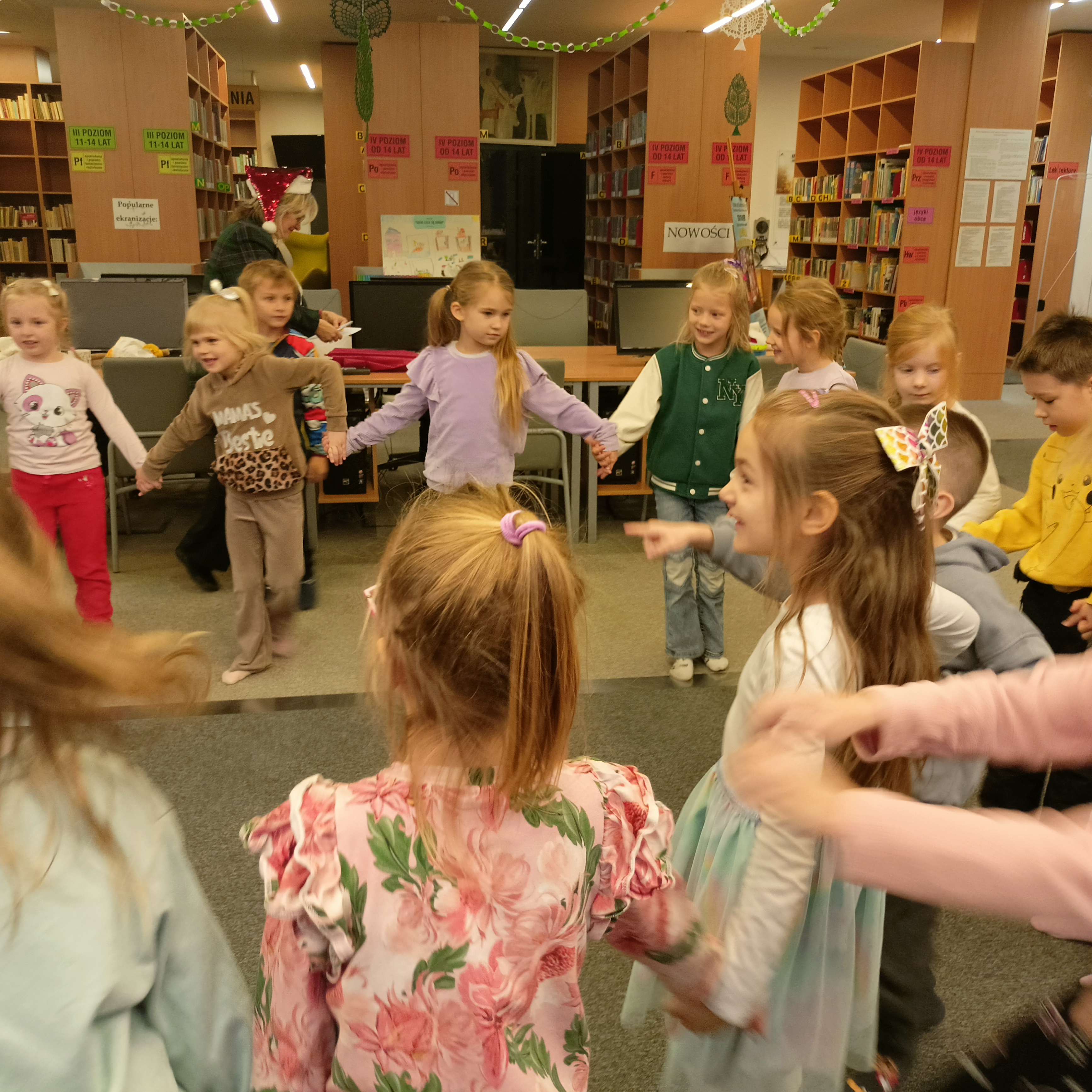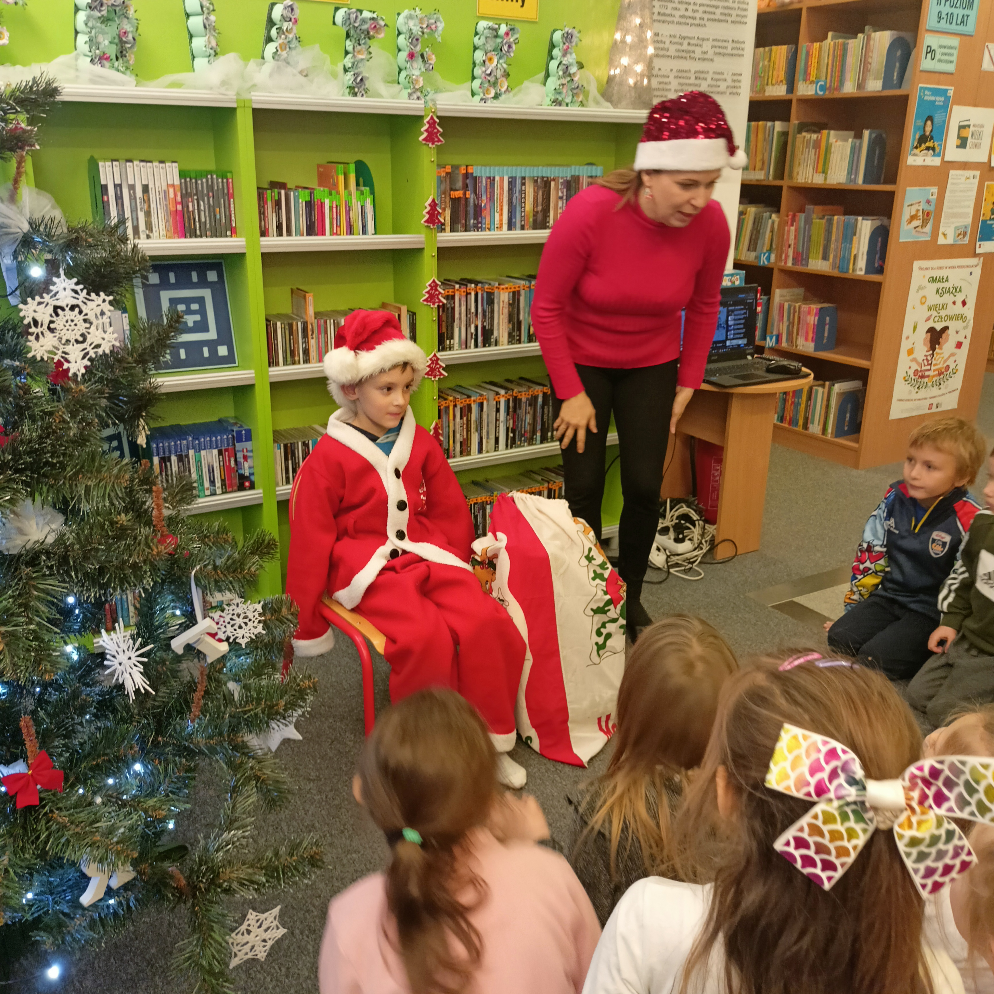 4 grudnia byliśmy na zajęciach Mikołajkowych w Mediatece. Bawiliśmy się wspanialep. Rozalia i Grześ odegrali role w mądrej bajce o zajączkach. Wspólnie szukaliśmy ukrytych w bibliotece na półkach 31 krasnoludków - nie odnaleźliśmy jednego. Poćwiczyliśmy i stworzyliśmy 35 metrów choinkowego łańcucha. Było super.