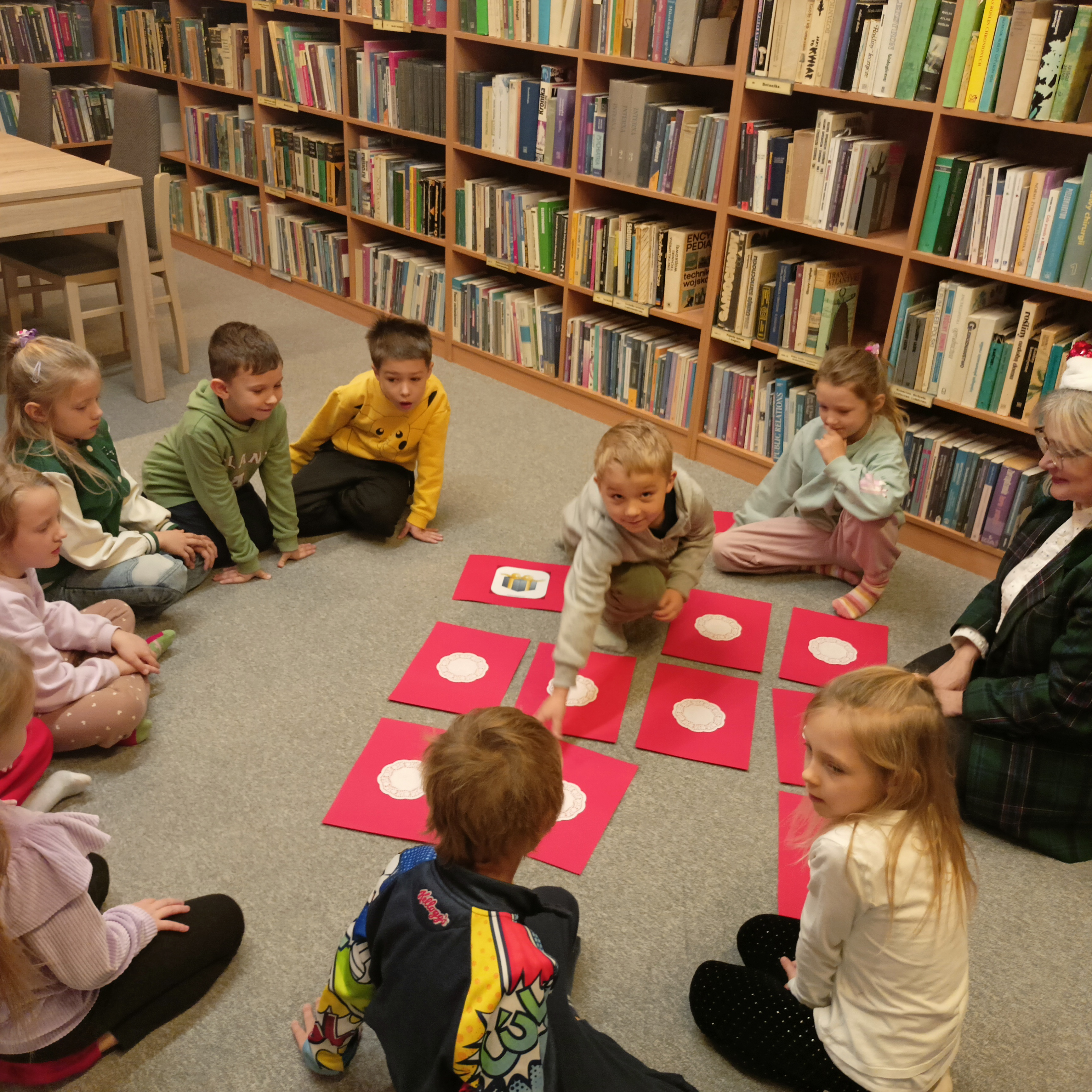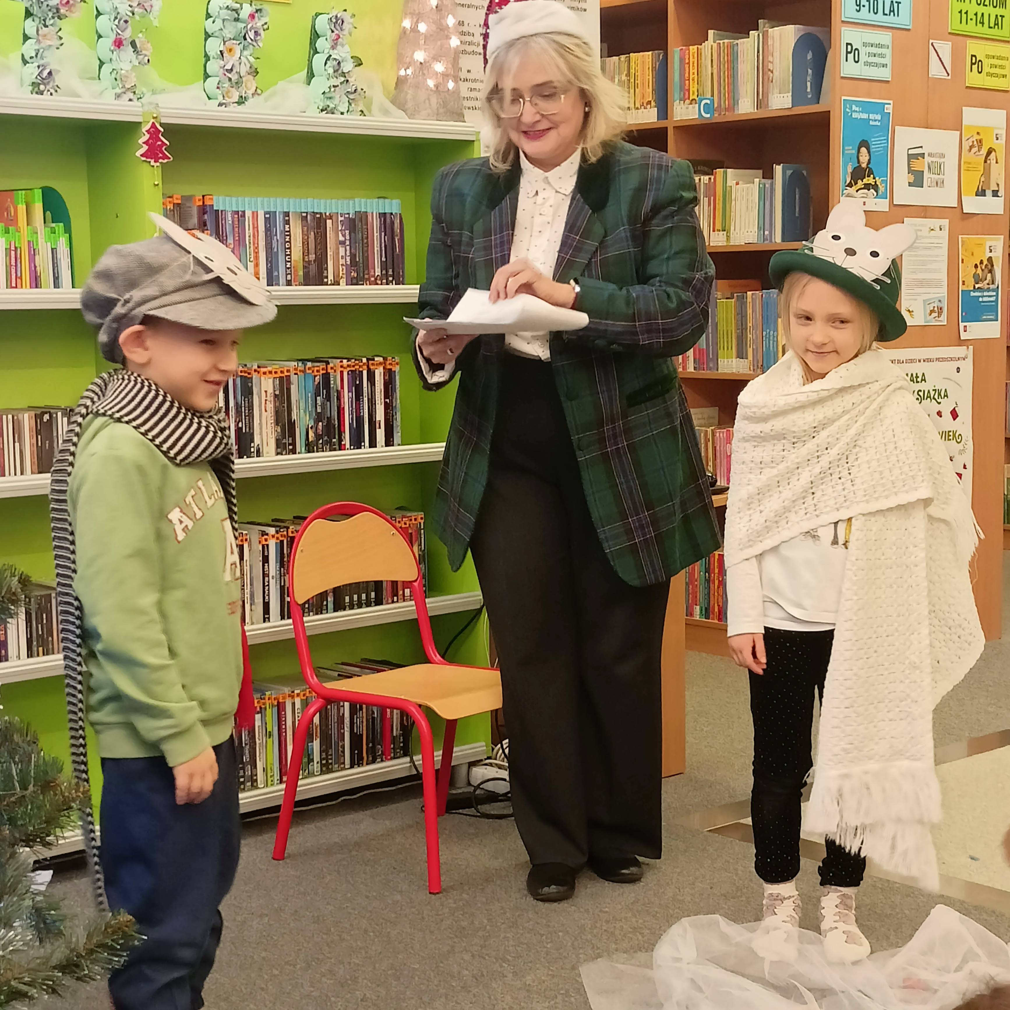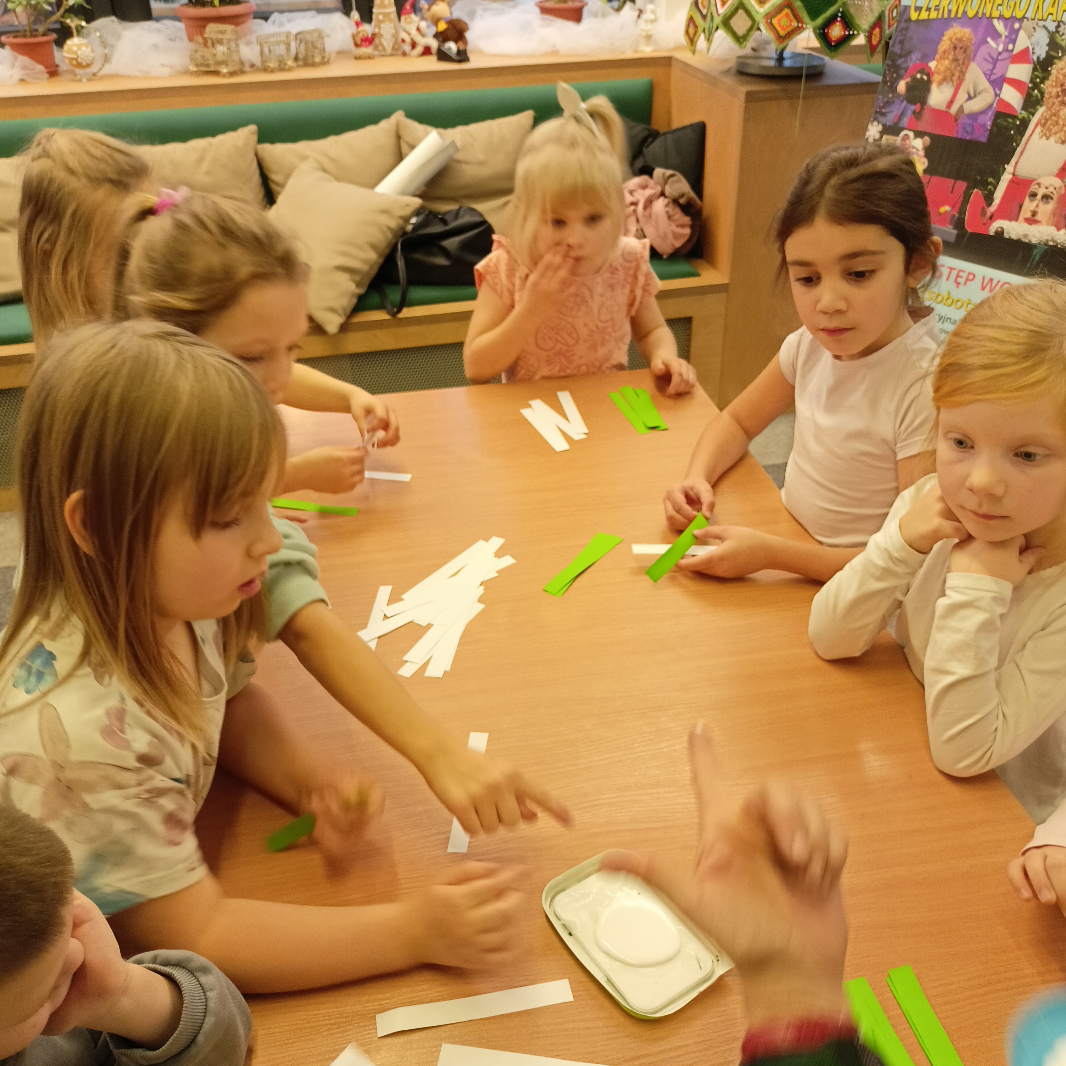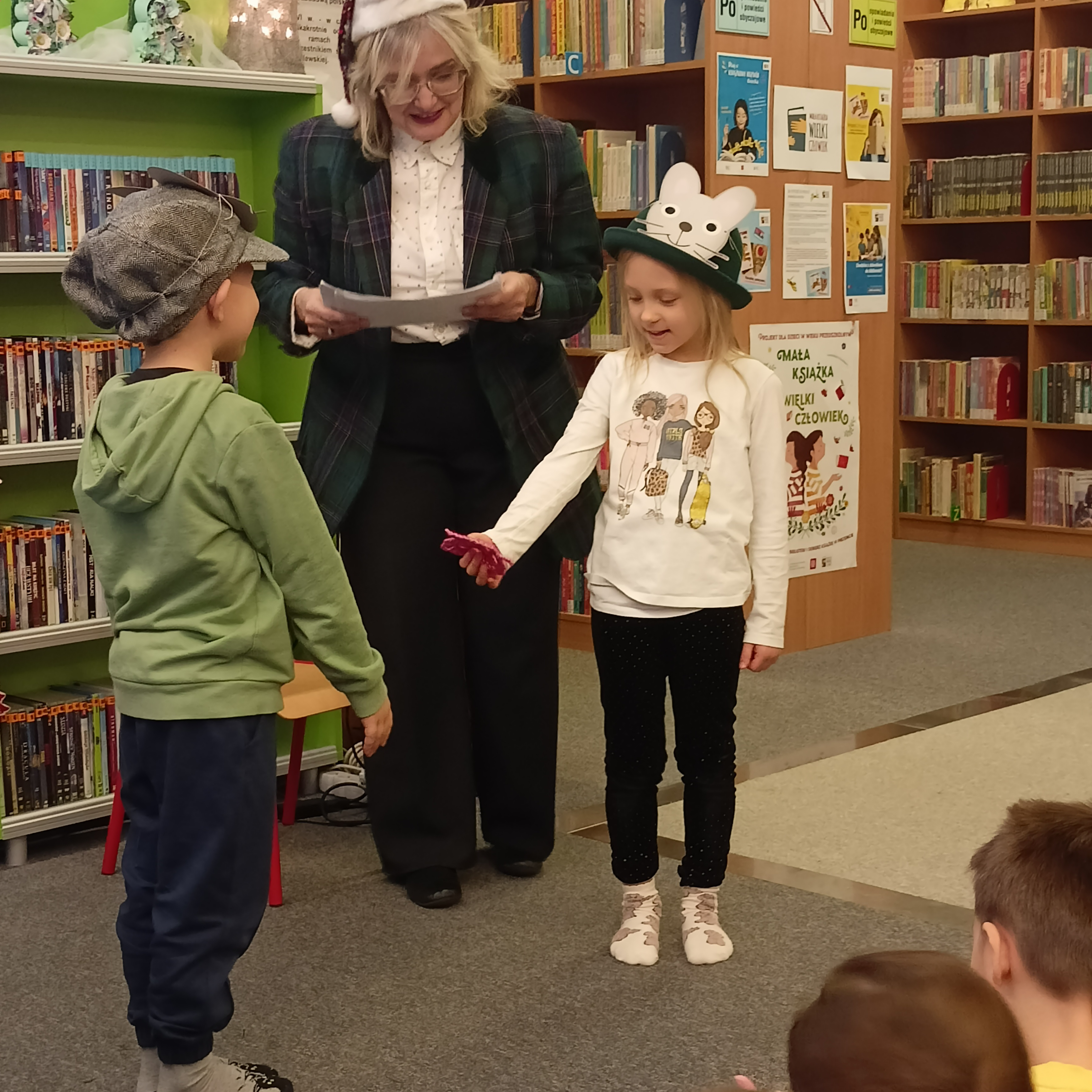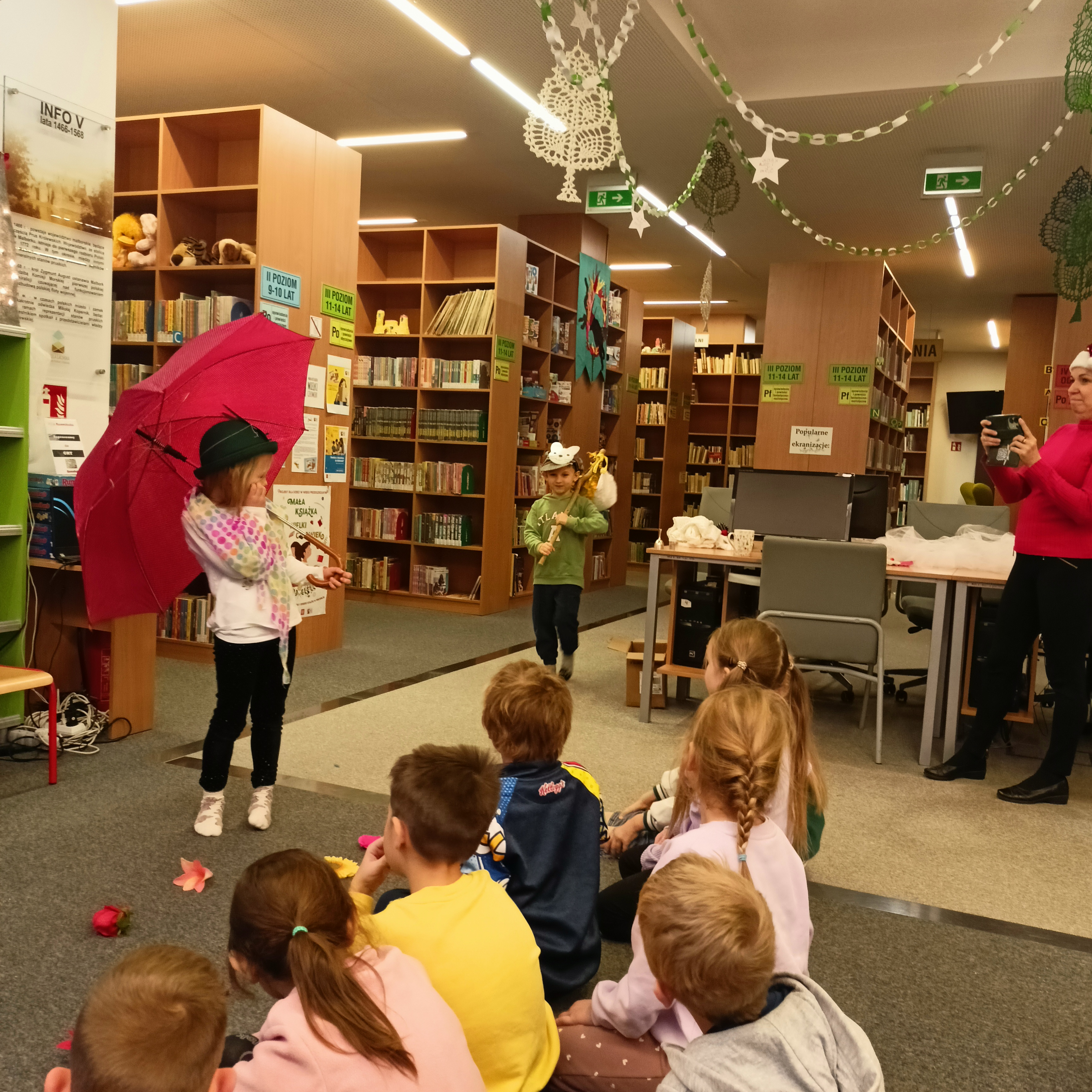 4 grudnia byliśmy na zajęciach Mikołajkowych w Mediatece. Bawiliśmy się wspanialep. Rozalia i Grześ odegrali role w mądrej bajce o zajączkach. Wspólnie szukaliśmy ukrytych w bibliotece na półkach 31 krasnoludków - nie odnaleźliśmy jednego. Poćwiczyliśmy i stworzyliśmy 35 metrów choinkowego łańcucha. Było super.